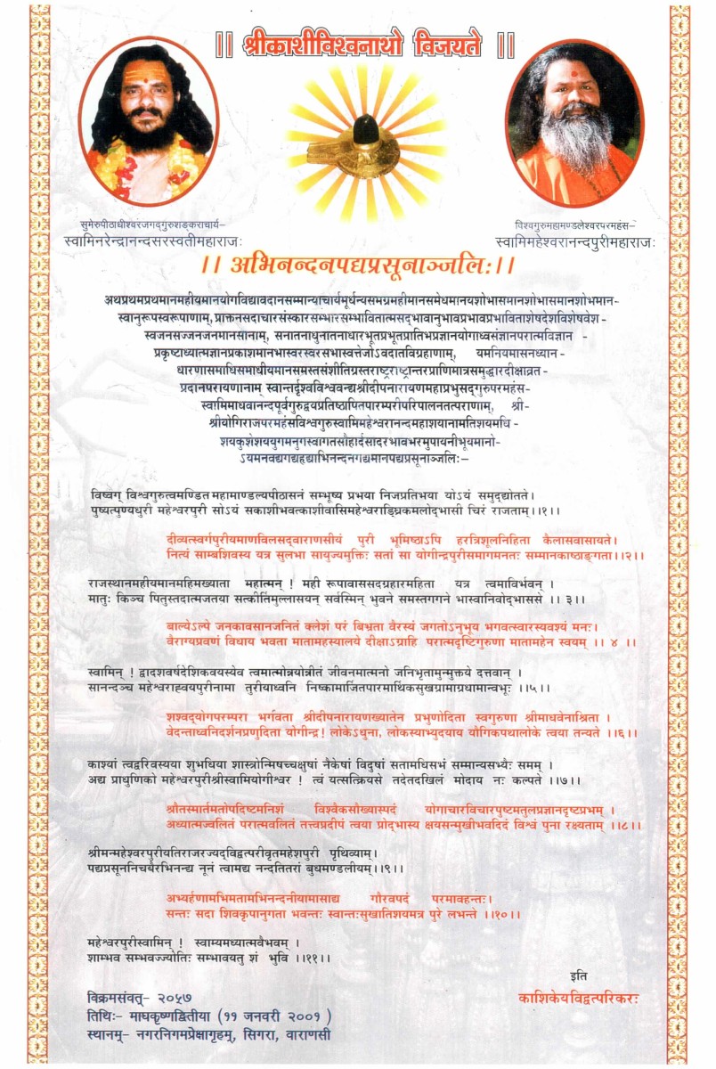 भारत में आदिकाल से प्रचलित महनीय योगविद्या के दान से सम्माननीय आचार्यों में आप मूर्धन्य हैं। समग्र पृथ्वी पर आपका यश प्रसृत है। उस यश से दीप्तिमन्त आपकी दीप्ति के तुल्य ही श्रीयुक्त आपका अपने अनुरूप ही स्वरूप है। प्राचीन सदाचार के संस्कारों के संभार से उत्पन्न अपने सद्भाव, अपनी महिमा के प्रभाव से आपने सभी देशों के आत्मीयजनों अर्थात् प्रवासी भारतीयों और सज्जनों के मन में विशेष स्थान बना लिया है। सनातन अर्थात् पारम्परिक एवं आधुनिकता दोनों के आधारभूत अपनी प्रभूत अन्त:प्रज्ञा द्वारा जाने गये योगमार्ग के ज्ञान से परात्मज्ञान एवं प्रकृष्ट अध्यात्मज्ञान के प्रकाशमान होने से आप तेजयुक्त वाणी तथा तेजस्विता से पवित्रा विग्रह वाले हो गये हैं। अपने एवं अन्य राष्ट्रों के समस्त संशयग्रस्त जनों के संशयों का यम, नियम, आसन, धारणा, ध्यान और समाधि द्वारा समाधान करते हुए आप उनके उद्धार हेतु उन्हें दीक्षाव्रत प्रदान करते रहते हैं। अन्तर्दृष्टि से सम्पन्न विश्ववन्द्य श्री दीपनारायण महाप्रभु एवं सद्गुरु परमहंस स्वामी माधवानन्द श्रीयोगिराज परमहंस विश्वगुरु महेश्वरानन्द महाशय, जिनके हस्तयुगल में कमल का निवास है अर्थात् जिनके हस्तकमलों में लक्ष्मी निवास करती है ऐसे आपके चरणचिह्नों पर चलने वालों के द्वारा स्वागत, सौहार्द व आदर से परिपूर्ण भेंटस्वरूप पवित्रा वाणी से अभिनन्दन करने वाली पद्यप्रसूनों की पुनीत अंजलि आपको समर्पित है :