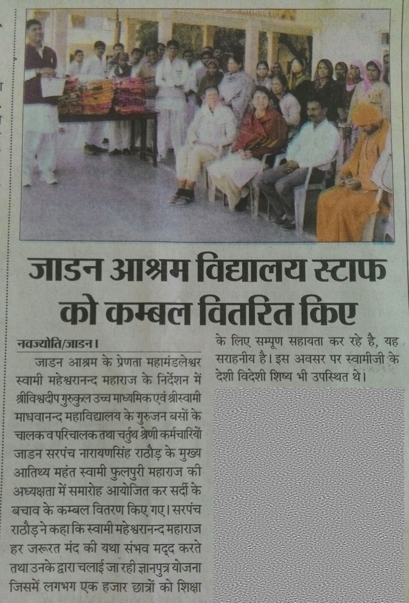 श्री अलखपुरीजी सिद्धपीठ परम्परा के पीठाधीश्वर विश्वगुरु महामण्डलेश्वर परमहंस स्वामी श्री महेश्वरानन्द पुरी जी महाराज द्वारा २५ दिसम्बर को सभी गरीब परिवारों व वहाँ कार्यरत सभी कर्मचारियों को ॐ विश्वदीप गुरुकुल आश्रम में कम्बल वित्तरित किये गये।